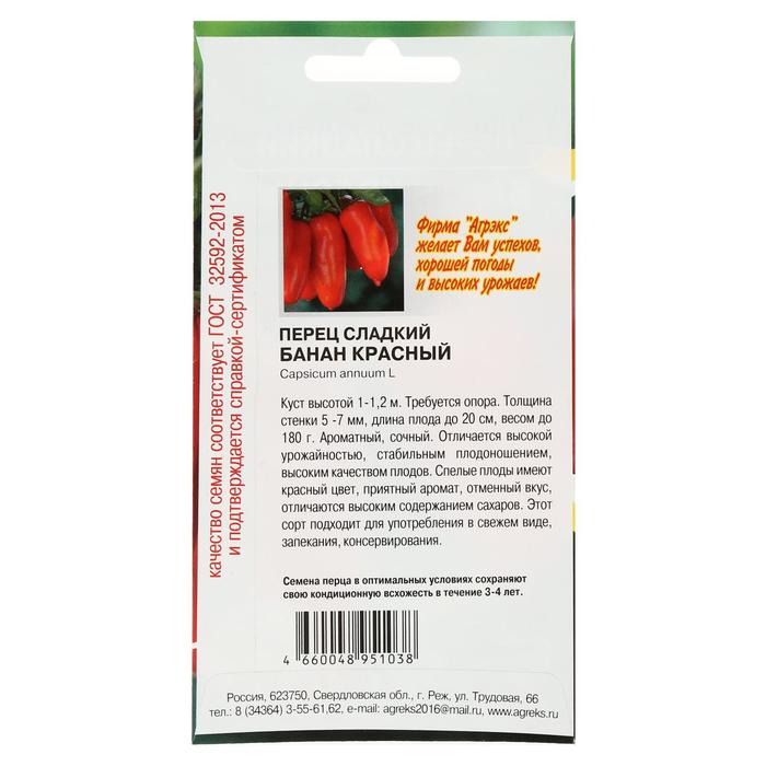 Производитель: АГРЭКС; Габариты: 15 x 8 x 0,1; Страна: Россия; В боксе: 500 шт; Состав: См. на упаковке; Материалы: см. на упаковке; Фасовка: по 10 шт; Индивидуальная упаковка: Без упаковки; Сертификат: Не подлежит сертификации; Цвет: Красный; Агрономический срок годности, лет: 3; Сроки созревания: Средний; Вкус: Сладкий; Особенности выращивания: Универсальный; Сорт или гибрид: Сорт; Толстостенный тип: Да; Высота: Среднерослый Куст высотой 1-1,2м. Требуется опора. Толщина стенки 5 мм., длина плода до 20 см., весом до 180 г. Ароматный, сочный. Сорт "Банан красный"  отличается высокой урожайностью, стабильным плодоношением, высоким качеством плодов. Спелые плоды имеют красный цвет, приятный аромат, отменный вкус, отличаются высоким содержанием сахаров. Этот сорт подходит для употребления в свежем виде, для запекания, консервирования. Растение отличается фантастической урожайностью.