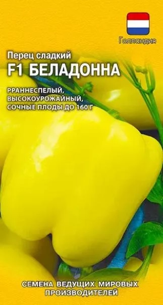 Раннеспелый (100-110 дней от всходов до плодоношения) высокоурожайный гибрид для открытого грунта и пленочных укрытий. Растение сомкнутое, среднерослое, сильнооблиственное. Плоды пониклые, глянцевые, кубовидные, 3-4-гнездные, длиной 10 см., диаметром 6 см., массой 130-160 гр., очень сочные. Толщина стенки 6-8 мм. Окраска незрелых плодов зеленовато-белая, зрелых — светло-желтая. Устойчив к вирусам. Рекомендуется для использования в свежем виде, домашней кулинарии и консервирования. Вкусовые качества прекрасные. Посев на рассаду — в марте. Пикировка — в фазе семядолей. Высадка рассады в грунт — в конце мая. Формировка: удаление всех боковых побегов и листьев до первой развилки. Урожайность 4,5-7,5 кг/м2.