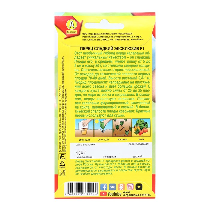 Производитель: Агрофирма АЭЛИТА; Габариты: 15 x 8 x 0,1; Страна: Россия; В боксе: 300 шт; Состав: См. на упаковке; Материалы: см. на упаковке; Фасовка: по 10 шт; Индивидуальная упаковка: Без упаковки; Сертификат: Не подлежит сертификации; Цвет: МИКС; Агрономический срок годности, лет: 3; Сроки созревания: Ранний; Вкус: Сладкий; Особенности выращивания: Открытый грунт, Закрытый грунт (теплицы, укрытия); Сорт или гибрид: Гибрид F1; Толстостенный тип: Да; Высота: Среднерослый