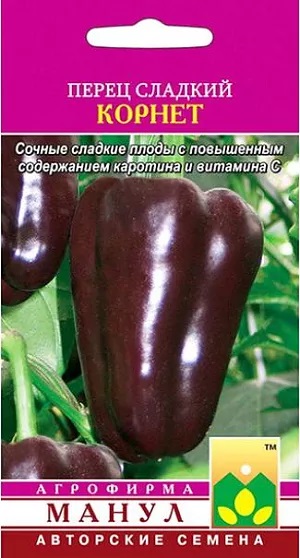 Семена Перец Корнет - урожайный, раннеспелый сорт: от всходов до технической спелости 105-115 дней, до биологической — 140 дней. Куст полудетерминантный, сильнорослый, слабооблиственный, высотой 120-160 см. в пленочных теплицах, и 180-200 см. — в зимних обогреваемых теплицах. Плоды пониклые, призмовидные, массой 180-220 гр., размером 8×7 см, трехкамерные, в технической спелости темно-зеленые, в биологической — коричневые; толщина перикарпия 5-6 мм.
