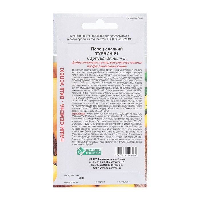 Производитель: Евросемена; Габариты: 15 x 8 x 0,2; Страна: Россия; В боксе: 100 шт; Состав: См. на упаковке; Материалы: см. на упаковке; Фасовка: по 10 шт; Индивидуальная упаковка: Без упаковки; Сертификат: Не подлежит сертификации; Цвет: Жёлтый; Агрономический срок годности, лет: 3; Сроки созревания: Ранний; Вкус: Сладкий; Особенности выращивания: Открытый грунт; Сорт или гибрид: Гибрид F1; Толстостенный тип: Да; Высота: Среднерослый Среднеранний (первые плоды созревают через 80 дней после высадки рассады) гибрид для открытого грунта, временных пленочных укрытий и теплиц. Растение полураскидистое, средней высоты (100-130 см). Плоды пониклые, кубовидные, глянцевые, с очень мясистыми толстыми стенками (до 8 мм) массой до 100-160 г. Окраска в технической спелости светло-зеленая, в биологической — темно-желтая. Гибрид жаростойкий, устойчив ВТМ. Урожайность плодов в открытом грунте до 6,0 кг/м?. Рекомендуется для употребления в свежем виде, фарширования, приготовления лечо и консервирования. Посев на рассаду — в конце февраля. Пикировка — в фазе 1-2 настоящих листьев. Высадка в теплицу — в конце мая. После высадки у растений удаляют боковые побеги и листья до первой развилки и подвязывают к опоре. Схема посадки: 40x60 см.