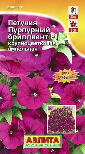 Семена Петуния ампельная Пурпурный бриллиант F1. Ампельная петуния типа сурфиний с непревзойденными декоративными качествами. Побеги хорошо ветвящиеся, крепкие, длиной до 80 см, обильно и равномерно покрыты крупными цветками диаметром 7-8 см. При выращивании в открытом грунте, одно растение способно быстро покрыть площадь до 1,5 м 2 . Цветение раннее и продолжительное. Гибрид устойчив к неблагоприятной погоде и болезням культуры, жаростойкий, засухоустойчивый..Посев семян на рассаду.