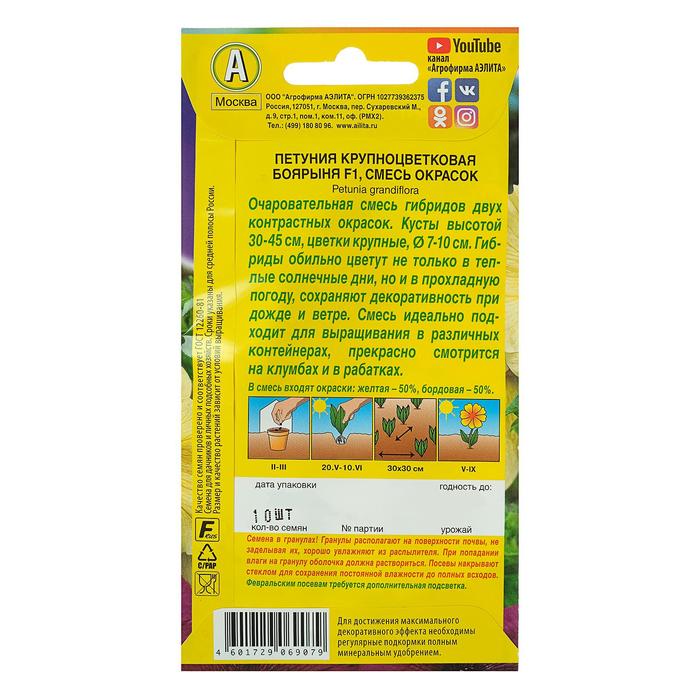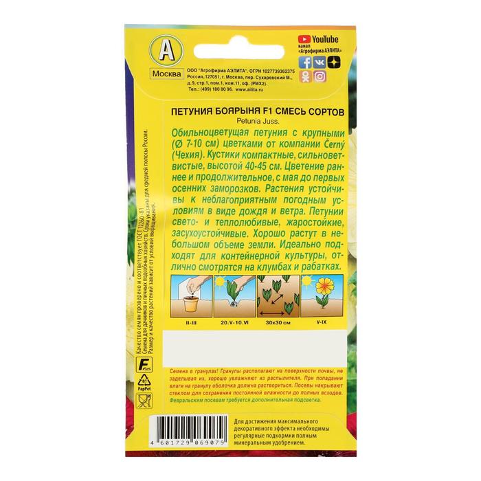 Производитель: Агрофирма АЭЛИТА; Габариты: 15 x 8 x 0,2; Страна: Чехия; В боксе: 200 шт; Состав: См. на упаковке; Материалы: см. на упаковке; Фасовка: по 4 шт; Индивидуальная упаковка: Без упаковки; Сертификат: Не подлежит сертификации; Цвет: МИКС; Агрономический срок годности, лет: 3; Вегетация: Однолетники; Вид: Петуния; Особенности выращивания: Открытый грунт; Сухоцвет: Нет; Махровые: Нет; По форме куста: Кустовая; Назначение: Для создания цветников, клумбы, Для балкона, веранды; Отношение к свету: Светолюбивые; Разновидность: Цветущее