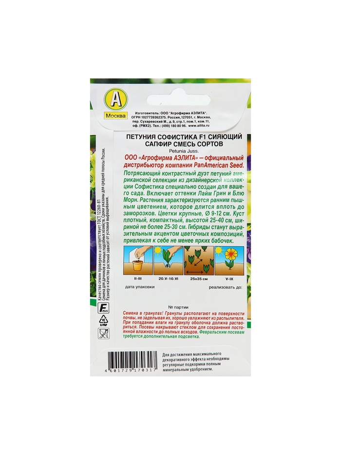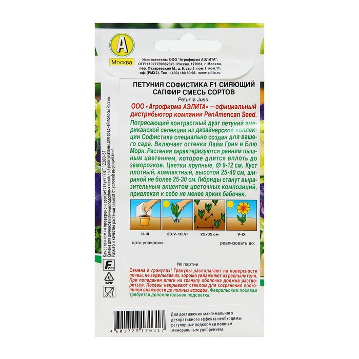 Производитель: Агрофирма АЭЛИТА; Габариты: 15 x 8 x 0,2; Страна: Коста-Рика; В боксе: 500 шт; Состав: См. на упаковке; Материалы: см. на упаковке; Фасовка: по 10 шт; Индивидуальная упаковка: Без упаковки; Сертификат: Не подлежит сертификации; Цвет: МИКС; Агрономический срок годности, лет: 5; Вегетация: Однолетники; Вид: Петуния; Особенности выращивания: Открытый грунт; Сухоцвет: Нет; Махровые: Нет; По форме куста: Кустовая; Назначение: Для балкона, веранды, Для создания цветников, клумбы; Отношение к свету: Светолюбивые; Разновидность: Цветущее; Нуждаются ли в стратификации: Нет; Фиксированная цена: Да