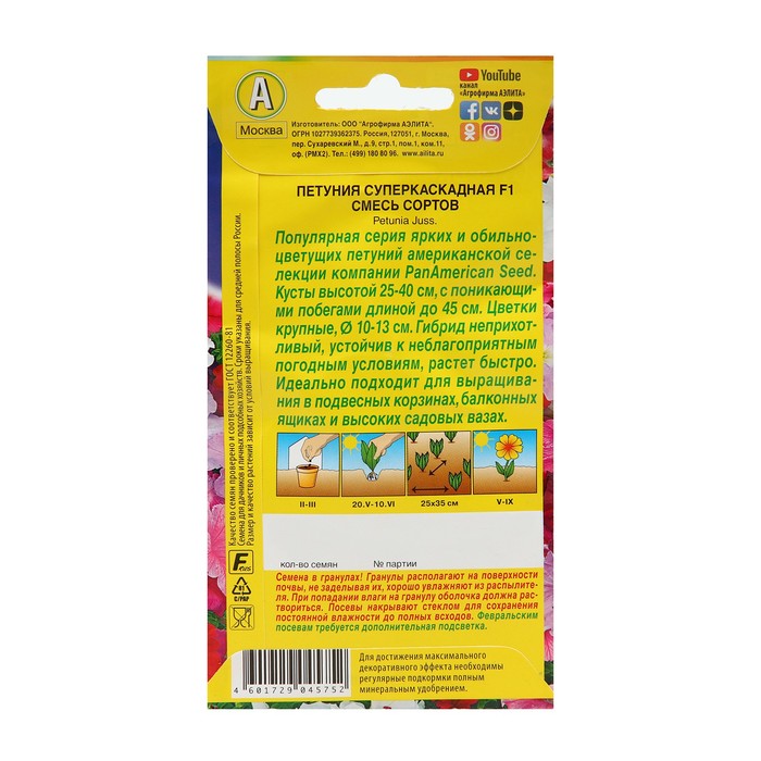 Производитель: Агрофирма АЭЛИТА; Габариты: 15 x 8 x 0,3; Страна: США; В боксе: 500 шт; Состав: См. на упаковке; Материалы: см. на упаковке; Фасовка: по 10 шт; Индивидуальная упаковка: Без упаковки; Сертификат: Не подлежит сертификации; Цвет: МИКС; Агрономический срок годности, лет: 3; Вегетация: Однолетники; Вид: Петуния; Особенности выращивания: Открытый грунт; Сухоцвет: Нет; Махровые: Нет; По форме куста: Кустовая; Назначение: Для балкона, веранды, Для создания цветников, клумбы; Отношение к свету: Светолюбивые; Разновидность: Цветущее; Нуждаются ли в стратификации: Нет; Фиксированная цена: Да