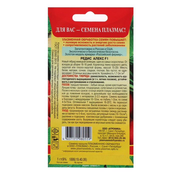 Производитель: Плазмас; Габариты: 15 x 8 x 0,4; Страна: Россия; В боксе: 1000 шт; Состав: См. на упаковке; Материалы: см. на упаковке; Фасовка: по 10 шт; Индивидуальная упаковка: Без упаковки; Сертификат: Не подлежит сертификации; Сроки созревания: Сверхранний (скороспелый); Посев (посадка) в грунт: Апрель, Июнь, Август, Июль, Май, Сентябрь; Упаковка: Цветная; Место выращивания: Открытый грунт; Сорт или гибрид: Гибрид F1; Вегетационный период, дни: 16; Цвет плода: Розовый; Вид: Семечки; Форма: Круглая; С белым кончиком: Нет Корнеплоды устойчивы к растрескиванию и дряблению, ярко-красные, с тоненьким хвостиком, с сочной, хрустящей белоснежной мякотью и отличным вкусом. Рекомендуется для выращивания на раннюю пучковую продукцию. Агротехника. Посев в открытый грунт проводят на глубину 2 см.