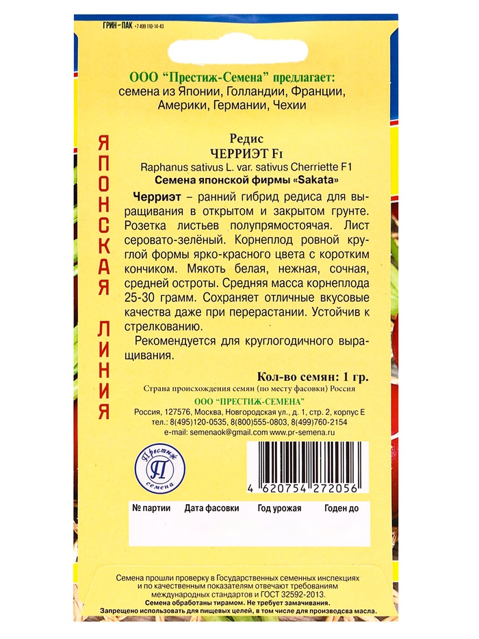 Производитель: Престиж семена; Габариты: 15 x 8 x 0,2; Страна: Россия; В боксе: 1250 шт; Состав: Семена; Материалы: семена; Фасовка: по 10 шт; Индивидуальная упаковка: Без упаковки; Сертификат: Не подлежит сертификации; Сроки созревания: Ранний; Посев (посадка) в грунт: Апрель, Сентябрь, Август, Июнь, Май, Июль; Упаковка: Цветная; Место выращивания: Универсальный; Сорт или гибрид: Гибрид F1; Вегетационный период, дни: 26; Цвет плода: Розовый; Вид: Семечки; Форма: Круглая; С белым кончиком: Нет Ранний гибрид редиса для выращивания в открытом и закрытом грунте. Розетка листьев полупрямостоячая. Лист серовато-зелёный. Корнеплод ровной круглой формы ярко-красного цвета с коротким кончиком. Мякоть белая, нежная, сочная, средней остроты. Средняя масса корнеплода 25-30 грамм. Сохраняет отличные вкусовые качества даже при перерастании. Устойчив к стрелкованию. Рекомендуется для круглогодичного выращивания.