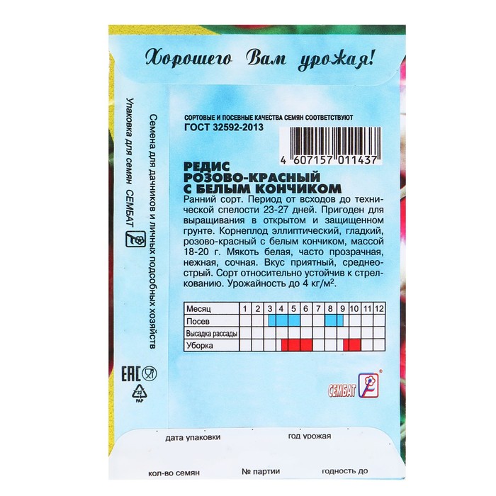 Производитель: Сембат; Габариты: 11 x 8 x 0,2; Страна: Россия; В боксе: 800 шт; Состав: Семена; Материалы: семена; Фасовка: по 10 шт; Индивидуальная упаковка: Без упаковки; Сертификат: Не подлежит сертификации; Агрономический срок годности, лет: 4; Сроки созревания: Ранний; Посев в грунт: Июнь, Апрель, Июль, Май, Сентябрь, Август; Особенности выращивания: Открытый грунт; Сорт или гибрид: Сорт; Цвет плода: Розовый; Вид: Семечки; Форма: Круглая; С белым кончиком: Нет