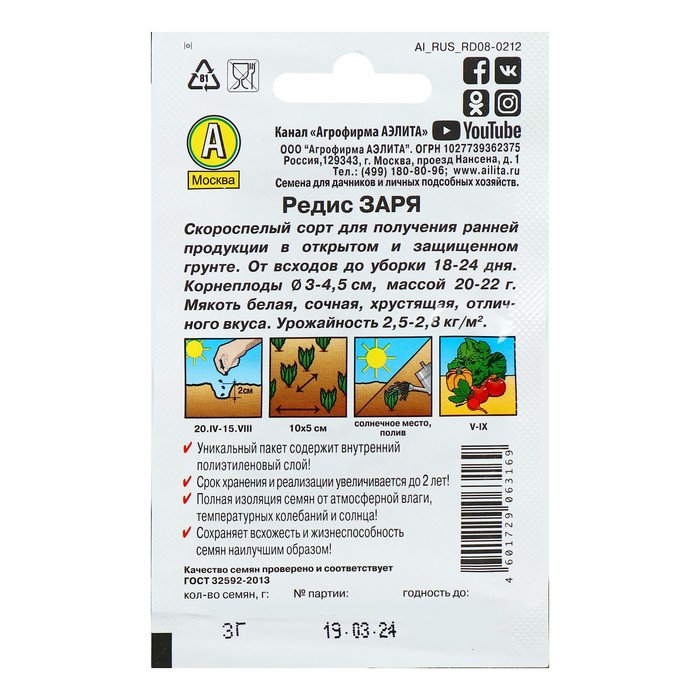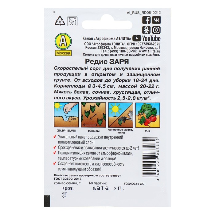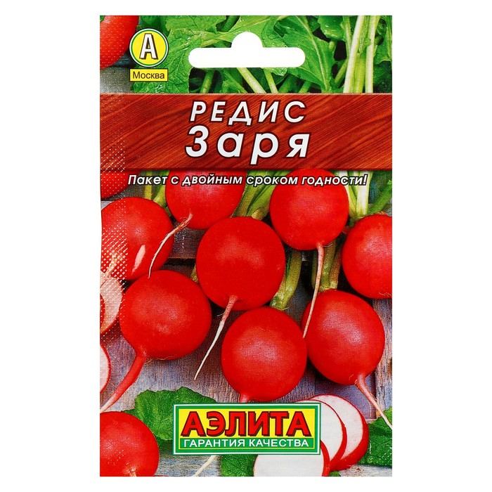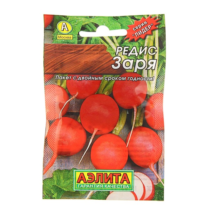 Производитель: Агрофирма АЭЛИТА; Габариты: 0,3 x 7,5 x 12; Страна: Польша; В боксе: 1500 шт; Состав: См. на упаковке; Материалы: см. на упаковке; Фасовка: по 10 шт; Индивидуальная упаковка: Без упаковки; Сертификат: Не подлежит сертификации; Количество семян, г: 2; Сроки созревания: Ранний; Посев (посадка) в грунт: Май, Сентябрь, Июнь, Апрель, Август, Июль; Упаковка: Цветная; Место выращивания: Открытый грунт; Сорт или гибрид: Сорт; Цвет плода: Розовый; Вид: Семечки; Форма: Круглая; С белым кончиком: Нет «Заря» — популярный скороспелый сорт. Плодоношение начинается на 22–30-й день от всходов. Крупный тёмно-красный корнеплод диаметром 3–4 см и массой 18–20 г имеет сочный слабоострый вкус. Отличается устойчивостью к комплексу характерных заболеваний и высокой урожайностью. Прекрасно подходит для употребления в свежем виде, салатах и бутербродах. Посев Семена высаживают с 20 апреля по 25 августа по схеме 7 х 7 см. Глубина заделки — 2 см. Уборка С 25 мая по 1 октября.
