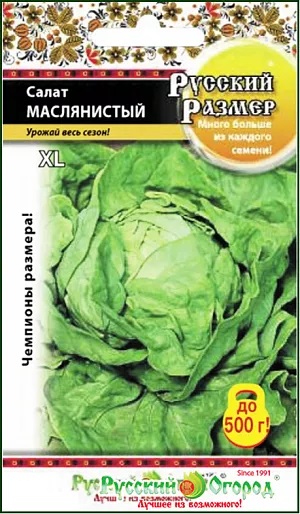 Семена Салат Маслянистый Русский Размер. Самый крупный среди маслянистых салатов: плотные головки достигают массы не менее 500 г! Лист средне-зеленый, сочный, очень нежного вкуса. Можно высевать с весны до осени. Весь сезон, до первых заморозков обеспечит вас богатым урожаем. Устойчив к основным заболеваниям.