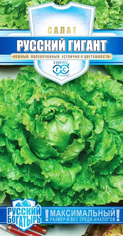 Артикул: 1175; Бренд товара: Гавриш; Фасовка: 0,5 г; Срок отправки: ежедневно Семена Салат Русский богатырь. Полукочанный среднеспелый (62-64 дня от полных всходов до уборки зелени) сорт для выращивания в открытом грунте. Образует мощную полуприподнятую розетку листьев высотой 25-30 см и диаметром 30-40 см. При хорошем уходе достигает массы 500 г. Листья нежные, полухрустящей консистенции, приятного освежающего вкуса. Отличается быстрым ростом при любой длине светового дня. Выращивают рассадным способом или прямым посевом в открытый грунт. Для непрерывного получения урожая посевы рекомендуется повторять с интервалом в 1,5-2 месяца. Уход заключается в прополках, рыхлениях, обильных, но редких поливах.