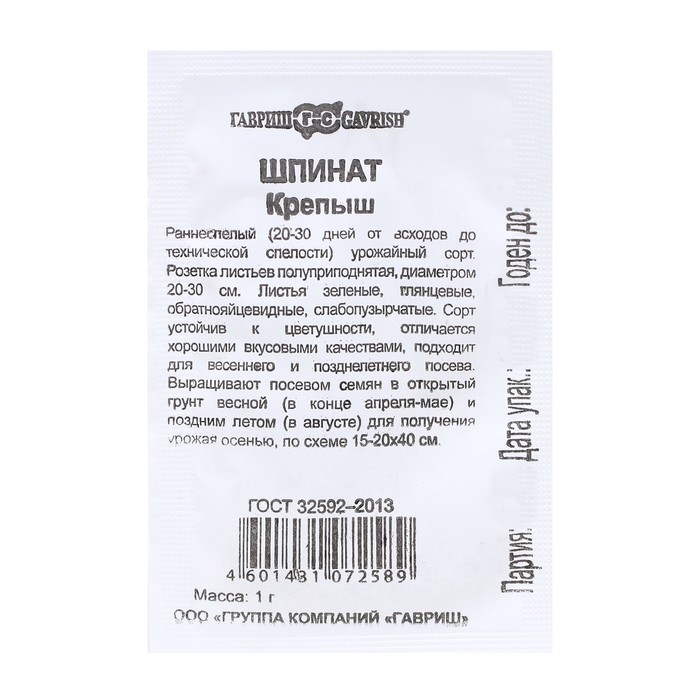 Производитель: Гавриш; Габариты: 11,5 x 7,5 x 0,1; Страна: Россия; В боксе: 200 шт; Состав: См. на упаковке; Материалы: см. на упаковке; Фасовка: по 3 шт; Индивидуальная упаковка: Без упаковки; Сертификат: Не подлежит сертификации; Агрономический срок годности, лет: 3; Сроки созревания: Средний; Особенности выращивания: Открытый грунт