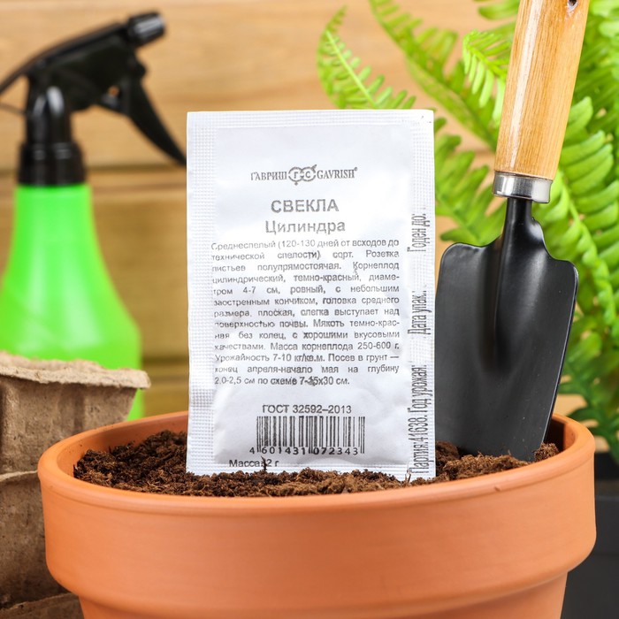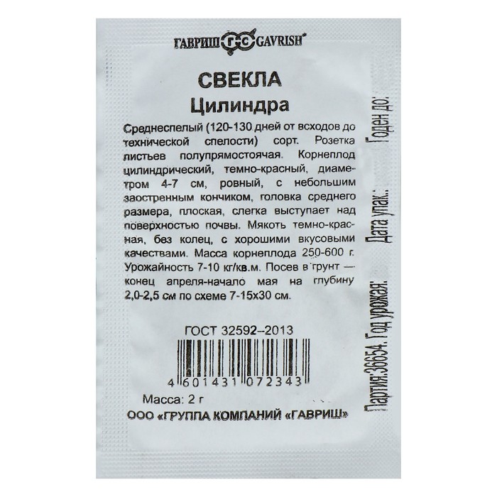 Производитель: Гавриш; Габариты: 11 x 8 x 0,1; Страна: Россия; В боксе: 700 шт; Состав: См. на упаковке; Материалы: см. на упаковке; Фасовка: по 10 шт; Индивидуальная упаковка: Без упаковки; Сертификат: Не подлежит сертификации; Сроки созревания: Средний; Посев (посадка) в грунт: Май, Апрель; Упаковка: Белая; Место выращивания: Открытый грунт; Сорт или гибрид: Сорт; Вегетационный период, дни: 120; Вид: Простые семена; Форма: Цилиндрическая Среднеспелый (120-130 дней от всходов до технической спелости) сорт. Посев в грунт конец апреля – начало мая. Схема посадки 30х6 см на глубину 2,0-2,5 см. Розетка листьев полупрямостоячая. Корнеплод цилиндрический, темно-красный, диаметром 4-7 см, ровный, с небольшим заостренным кончиком, головка среднего размера, плоская слегка выступает над поверхностью почвы. Мякоть темно-красная, без колец. Корнеплод легко выдергивается. Масса корнеплода 250-600 г. Вкусовые качества хорошие. Сорт характеризуется высокой товарностью, урожайностью и выравненностью корнеплодов. Рекомендован для консервирования и хранения. Урожайность 7-10 кг/м2.