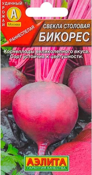 Семена Свекла столовая Бикорес. Популярный, надежный раннеспелый сорт. От всходов до технической спелости 80-100 дней. Корнеплоды выравненные, гладкие, массой 150-200 г, с тонкой кожицей и компактной листовой розеткой. Мякоть равномерной насыщенно-красной окраски, без колец, нежная и сочная. Рекомендуется для различной домашней кулинарии, приготовления сока и консервирования. Отлично транспортируется и хранится всю зиму. Сорт устойчив к цветушности и церкоспорозу. Благодаря мощной корневой системе подходит для выращивания в засушливых регионах. Урожайность – 5-6 кг/м2.