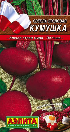 Семена Свекла столовая Кумушка. Раннеспелый, засухоустойчивый сорт с высокой урожайностью – до 10 кг/ м2 . Убирают на 80-95 день после всходов. Корнеплоды массой 250-400 г, ровные, плоскоокруглой формы. Мякоть темно-красная, без колец и грубых волокон. Нежная, сладкая и сочная. Сохраняет насыщенный цвет при варке. Сорт прекрасно подходит для получения ранней пучковой продукции, устойчив к стрелкованию. Отлично хранится, не теряя вкус и вид.