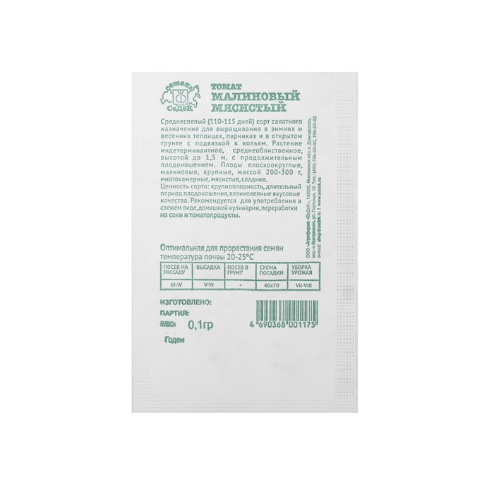 Производитель: СеДеК; Габариты: 11,5 x 8 x 0,2; Страна: Россия; В боксе: 2100 шт; Состав: См. на упаковке; Материалы: см. на упаковке; Фасовка: по 10 шт; Индивидуальная упаковка: Без упаковки; Сертификат: Не подлежит сертификации; Цвет: Красный; Агрономический срок годности, лет: 4; Сроки созревания: Средний; Особенности выращивания: Закрытый грунт (теплицы, укрытия); Сорт или гибрид: Гибрид F1; Форма томатов: Биф-томаты; Тип роста: Индетерминантный (высокорослый)
