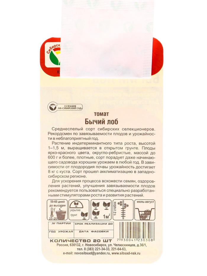 Производитель: Сибирский сад; Габариты: 15 x 8 x 0,2; Страна: Россия; В боксе: 500 шт; Состав: Семена; Материалы: семена; Фасовка: по 10 шт; Индивидуальная упаковка: Без упаковки; Сертификат: Не подлежит сертификации; Цвет: Красный; Вид грунта: Универсальный; Сроки созревания: Средний; Посев на рассаду: Февраль, Март; Упаковка: Цветная; Место выращивания: Универсальный; Сорт или гибрид: Сорт; Вегетационный период, дни: 111; Форма томатов: Плоскоокруглые; Сорт: Бычий лоб; Тип роста: Индетерминантный (высокорослый); Применение: Универсальное; Вес: Суперкрупноплодные (свыше 200 г); Нуждаются в пасынковании: Да; Урожайность, м²: 8 Рекордсмен по завязываемости плодов и урожайности в неблагоприятный год. Растение индетерминантного типа роста, высотой 1-1,5 м, выращивается в открытом грунте. Плоды ярко-красного цвета, округло-ребристые, массой до 600 г и более, плотные, сорт порадует даже начинающего садовода хорошим урожаем в любой год. В зависимости от плодородия почвы урожайность достигает 8 кг с куста. Сорт прошел акклиматизацию в западно-сибирском регионе.