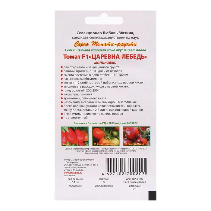 Производитель: Любовь Мязина; Габариты: 15 x 8 x 0,2; Страна: Россия; В боксе: 150 шт; Состав: См. на упаковке; Материалы: см. на упаковке; Фасовка: по 10 шт; Индивидуальная упаковка: Без упаковки; Сертификат: Не подлежит сертификации; Цвет: Розовый; Агрономический срок годности, лет: 4; Сроки созревания: Ранний; Особенности выращивания: Открытый грунт; Сорт или гибрид: Гибрид F1; Форма томатов: Сливовидные Семена томата малиновый высевают в рассадные ящики в первой половине марта. Посев в грунт осуществляется в начале мая. В открытую почву рассаду пересаживают в середине мая. Место для грядок выбирают хорошо освещенное. Почва для высадки должна быть питательной, мягкой. Сорт раннеспелый. Яркие, насыщенные кораллово-красные плоды можно собирать через 95-100 дней после появления первых всходов. С одного куста можно получить до 5 кг урожая. Томаты употребляются не только в свежем виде. Подходят они и для переработки.