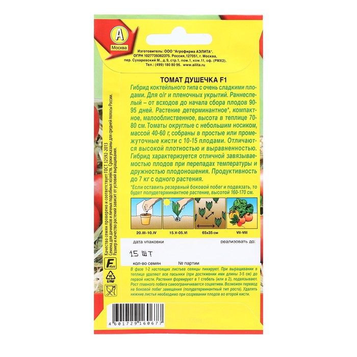Производитель: Агрофирма АЭЛИТА; Габариты: 15 x 8 x 0,1; Страна: Россия; В боксе: 100 шт; Состав: См. на упаковке; Материалы: см. на упаковке; Фасовка: по 1 шт; Индивидуальная упаковка: Без упаковки; Сертификат: Не подлежит сертификации; Цвет: Красный; Агрономический срок годности, лет: 4; Сроки созревания: Ранний; Особенности выращивания: Универсальный; Сорт или гибрид: Гибрид F1; Форма томатов: С носиком; Сорт: F1; Тип роста: Детерминантный (среднерослый)