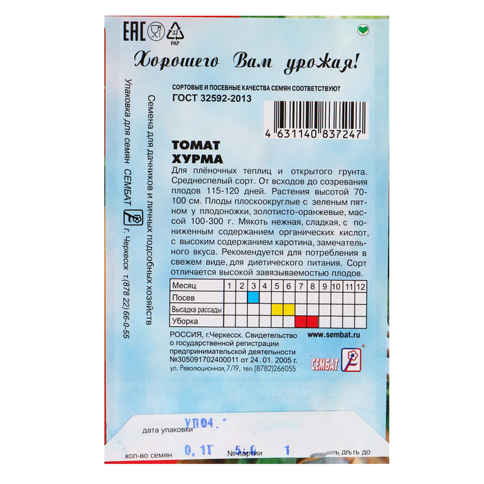 Производитель: Сембат; Габариты: 11 x 8 x 0,2; Страна: Россия; В боксе: 1500 шт; Состав: Семена; Материалы: семена; Фасовка: по 10 шт; Индивидуальная упаковка: Без упаковки; Сертификат: Не подлежит сертификации; Цвет: Оранжевый; Агрономический срок годности, лет: 4; Сроки созревания: Средний; Упаковка: Цветная; Особенности выращивания: Универсальный; Сорт или гибрид: Сорт; Вегетационный период, дни: 115 - 120; Форма томатов: Плоскоокруглые Среднеспелый среднерослый сорт для выращивания в пленочных теплицах и открытом грунте с подвязкой к кольям. Растение детерминантного типа (с ограниченным ростом), высотой 70-100 см. Плоды плоскоокруглые, золотисто-оранжевые, массой до 300 г, с нежной мякотью, содержат много каротина. Благодаря сбалансированному содержанию сахара и органических кислот очень приятного вкуса. Плоды прекрасно подойдут для приготовления свежих летних салатов. Сорт отличается продолжительным плодоношением. Посев на рассаду — в конце марта-начале апреля. Пикировка — в фазе первого настоящего листа. Высадка в грунт — в конце мая-начале июня. Подвязка, регулярные подкормки, сбор плодов в бланжевой спелости с последующим дозариванием увеличивает выход урожая до 3,0кг с растения.