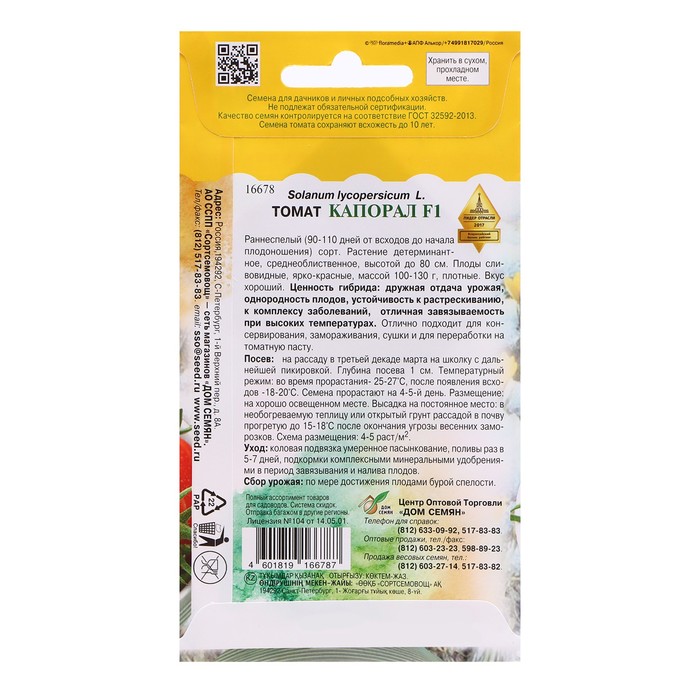 Производитель: Дом семян; Габариты: 15 x 8 x 0,1; Страна: Россия; В боксе: 100 шт; Состав: См. на упаковке; Материалы: см. на упаковке; Фасовка: по 10 шт; Индивидуальная упаковка: Без упаковки; Сертификат: Не подлежит сертификации; Цвет: Красный; Агрономический срок годности, лет: 4, 5; Сроки созревания: Ранний; Особенности выращивания: Универсальный; Сорт или гибрид: Гибрид F1; Форма томатов: Сливовидные