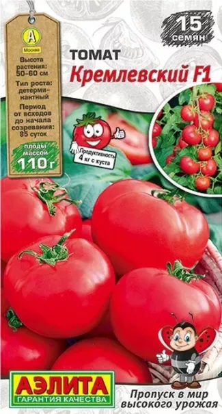 Семена Томат Кремлевский F1. Ультраскороспелый гибрид для получения сверхранней продукции в теплицах. Возможно выращивание в открытом грунте и под пленочными укрытиями с высадкой в обычные сроки. От всходов до созревания первых плодов около 85 суток. Растения детерминантные, низкорослые. Плоды* массой 100-110 г. формируются в простых кистях по 5-7 штук. Томаты средней плотности, сочные, но не водянистые. Гибрид устойчив к вертициллезу, фузариозному увяданию, ВТМ. Благо-даря раннеспелости уходит от поражения фитофторозом. Продуктивность около 4 кг с растения.