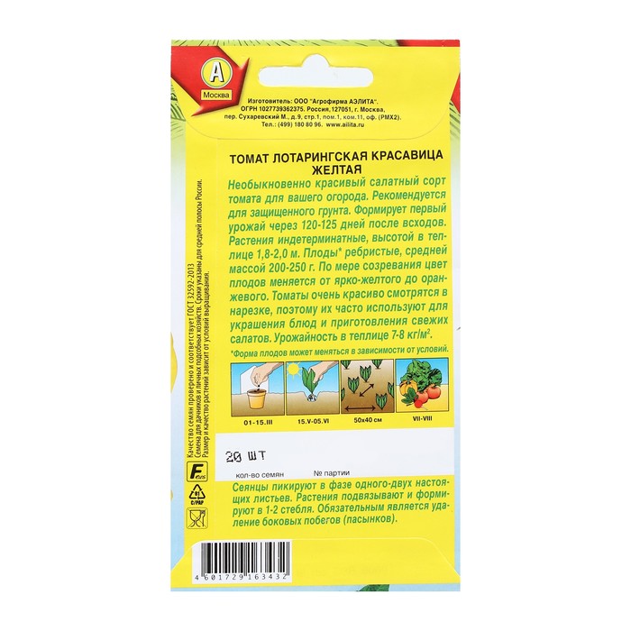 Производитель: Агрофирма АЭЛИТА; Габариты: 15 x 8 x 0,1; Страна: Россия; В боксе: 300 шт; Состав: См. на упаковке; Материалы: см. на упаковке; Фасовка: по 10 шт; Индивидуальная упаковка: Без упаковки; Сертификат: Не подлежит сертификации; Цвет: Жёлтый; Агрономический срок годности, лет: 4; Сроки созревания: Средний; Особенности выращивания: Закрытый грунт (теплицы, укрытия); Сорт или гибрид: Сорт; Форма томатов: Биф-томаты; Тип роста: Индетерминантный (высокорослый)