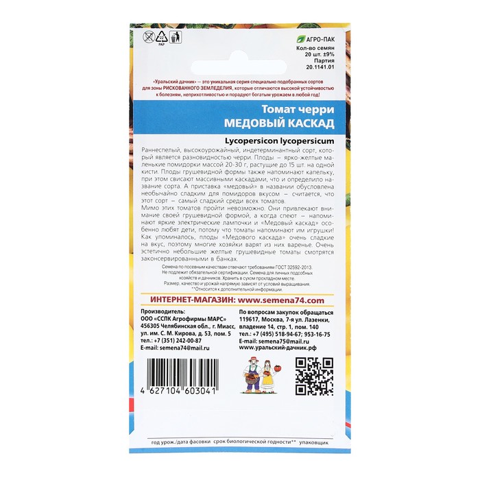 Производитель: Уральский Дачник; Габариты: 15 x 8 x 0,1; Страна: Россия; В боксе: 700 шт; Состав: Семена; Материалы: семена; Фасовка: по 10 шт; Индивидуальная упаковка: Без упаковки; Сертификат: Не подлежит сертификации; Цвет: Жёлтый; Сроки созревания: Ранний; Посев на рассаду: Апрель, Март; Место выращивания: Универсальный; Сорт или гибрид: Сорт; Форма томатов: Грушевидные; Применение: Для салатов, Универсальное; Вес: Мелкоплодные (Черри); Нуждаются в пасынковании: Да