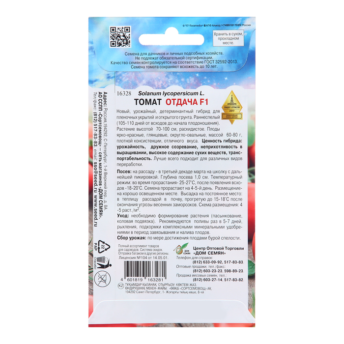 Производитель: Дом семян; Габариты: 15 x 8 x 0,2; Страна: Индия; В боксе: 200 шт; Состав: См. на упаковке; Материалы: см. на упаковке; Фасовка: по 10 шт; Индивидуальная упаковка: Без упаковки; Сертификат: Не подлежит сертификации; Цвет: Красный; Агрономический срок годности, лет: 4, 5; Сроки созревания: Среднеранний; Особенности выращивания: Открытый грунт; Сорт или гибрид: Гибрид F1; Форма томатов: Круглые Высокоурожайный раннеспелый сорт для выращивания в открытом и закрытом грунте. Плоды перцевидные, гладкие, оранжевого цвета, плотные, массой до 240 г, сладкие и сочные.Ценность сорта: устойчивость к растрескиванию, высокая урожайность и отличные вкусовые качества.Рекомендуются для употребления в свежем виде, кулинарной переработки, засолки и консервирования