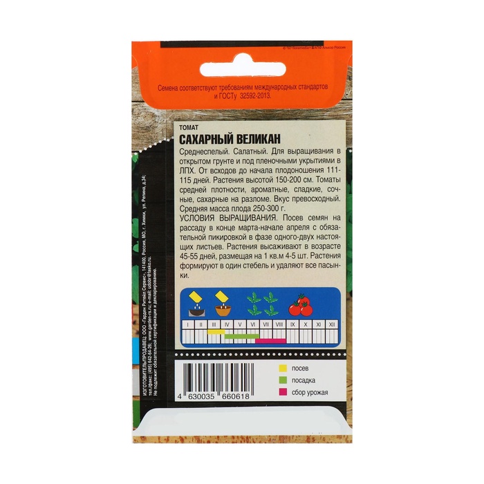Производитель: Тимирязевский питомник; Габариты: 15 x 8 x 0,1; Страна: Россия; В боксе: 100 шт; Состав: Семена; Материалы: семена; Фасовка: по 10 шт; Индивидуальная упаковка: Без упаковки; Сертификат: РСТ; Цвет: Красный; Сроки созревания: Средний; Посев на рассаду: Март, Апрель; Упаковка: Цветная; Место выращивания: Универсальный; Сорт или гибрид: Сорт; Форма томатов: Плоскоокруглые; Применение: Для салатов; Вес: Суперкрупноплодные (свыше 200 г); Нуждаются в пасынковании: Да; Урожайность, м²: 9 - 12 Среднеспелый. Салатный. Для выращивания в открытом грунте и под пленочными укрытиями в ЛПХ. От всходов до начала плодоношения 111-115 дней. Растения высотой 150-200 см. Томаты средней плотности, ароматные, сладкие, сочные, сахарные на разломе. Вкус превосходный. Средняя масса плода 250 300 г. Условия выращивания: посев семян на рассаду в конце марта-начале апреля с обязательной пикировкой в фазе одного-двух настоящих листьев. Растения высаживают в возрасте 45-55 дней, размещая на 1 кв.м 4-5 шт. Растения формируют в один стебель и удаляют все пасынки.