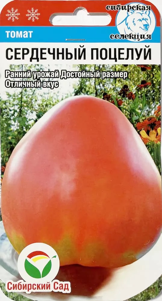 Бренд товара: Сибсад Фасовка: 20 шт Срок отправки: ежедневно Семена Томат Сердечный поцелуй. Раннеспелый крупноплодный сорт для открытого грунта и пленочных теплиц. Куст раскидистый, длина главного стебля в открытом грунте до 0,7м, в теплицах до 1,2м. Плоды аккуратной сердцевидной формы, практически гладкие, ярко-красного цвета. Средняя масса плодов около 300 грамм, максимальная, особенно на первой кисти, до 700 грамм. Мякоть плодов нежная, сахаристая, отменных вкусовых качеств. Экспертная дегустационная оценка - 4,8 балла. Сорт урожайный (до 3,5 кг с растения), хорошо приспособлен к условиям Сибири. Для получения более раннего урожая рекомендуется высаживать рассаду 55-дневного возраста . Посев на рассаду производят за 50-60 дней до высадки растений на постоянное место. Оптимальная постоянная температура прорастания семян 23-25 град. Сорт хорошо реагирует на полив и подкормки комплексными минеральными удобрениями. При высадке в грунт на 1 кв. м. размещают 3 растения. Выращивается в 1-2 стебля с подвязкой и пасынкованием. Для ускорения процесса всхожести семян, оздоровления растений, улучшения завязываемости плодов рекомендуется пользоваться специально разработанными стимуляторами роста и развития растений. Комментарии к товару
