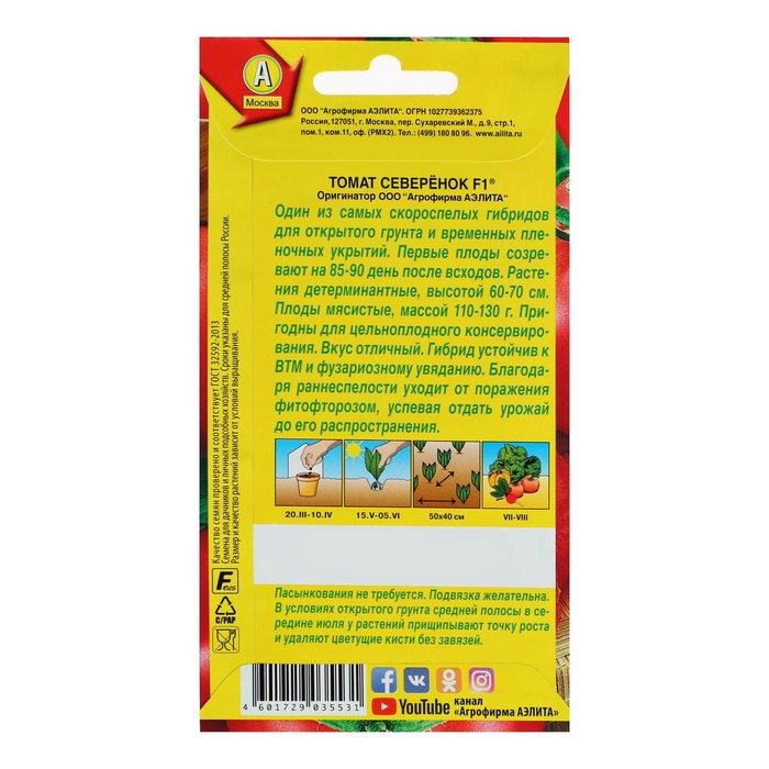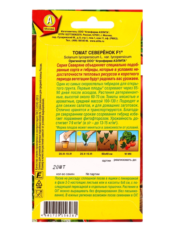 Производитель: Агрофирма АЭЛИТА; Габариты: 0,1 x 8 x 15; Страна: Китай; В боксе: 300 шт; Состав: См. на упаковке; Материалы: см. на упаковке; Фасовка: по 10 шт; Индивидуальная упаковка: Без упаковки; Сертификат: Не подлежит сертификации; Цвет: Красный; Вид грунта: Универсальный; Сроки созревания: Ранний; Посев на рассаду: Апрель, Март; Упаковка: Цветная; Место выращивания: Универсальный; Сорт или гибрид: Гибрид F1; Вегетационный период, дни: 87; Форма томатов: Плоскоокруглые; Сорт: F1; Тип роста: Детерминантный (среднерослый); Применение: Универсальное; Вес: Среднеплодные (от 25 до 150 г); Нуждаются в пасынковании: Нет