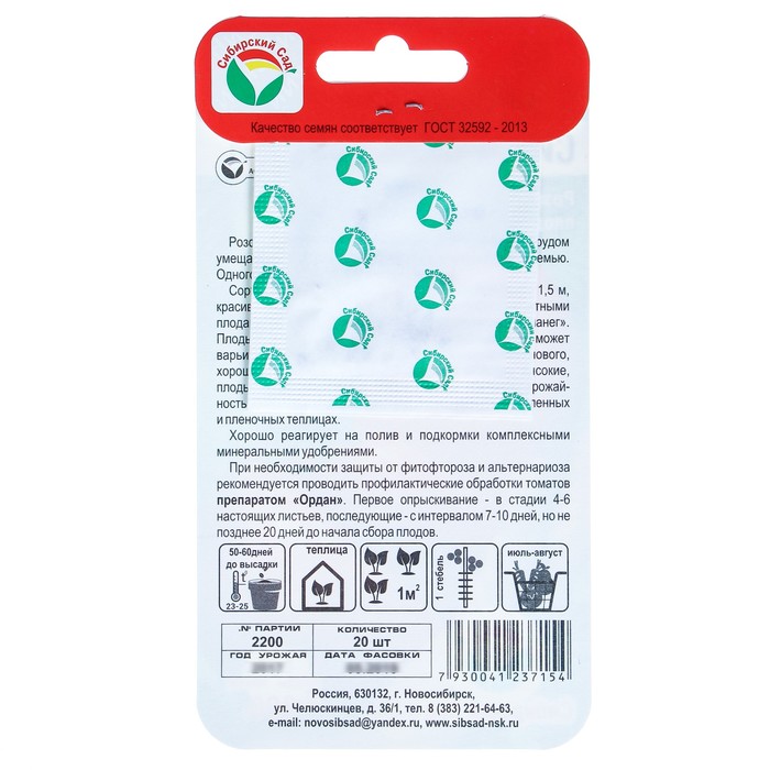 Производитель: Сибирский сад; Габариты: 0,2 x 8 x 15; Страна: Россия; В боксе: 1000 шт; Состав: Семена; Материалы: семена; Фасовка: по 10 шт; Индивидуальная упаковка: Без упаковки; Сертификат: Не подлежит сертификации; Цвет: Красный; Агрономический срок годности, лет: 4; Вид грунта: Закрытый; Сроки созревания: Ранний; Упаковка: Цветная; Особенности выращивания: Закрытый грунт (теплицы, укрытия); Сорт или гибрид: Сорт; Вегетационный период, дни: 95; Форма томатов: Плоскоокруглые; Тип роста: Детерминантный (среднерослый), Полудетерминантный (кистевой)