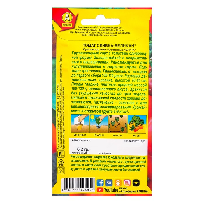 Производитель: Агрофирма АЭЛИТА; Габариты: 0,2 x 8 x 15; Страна: Россия; В боксе: 800 шт; Состав: См. на упаковке; Материалы: см. на упаковке; Фасовка: по 1 шт; Индивидуальная упаковка: Без упаковки; Сертификат: Не подлежит сертификации; Цвет: Красный; Агрономический срок годности, лет: 4; Сроки созревания: Ранний; Упаковка: Цветная; Особенности выращивания: Универсальный; Сорт или гибрид: Сорт; Вегетационный период, дни: 105 - 115; Форма томатов: Сливовидные; Сорт: Сливка–великан; Тип роста: Детерминантный (среднерослый)