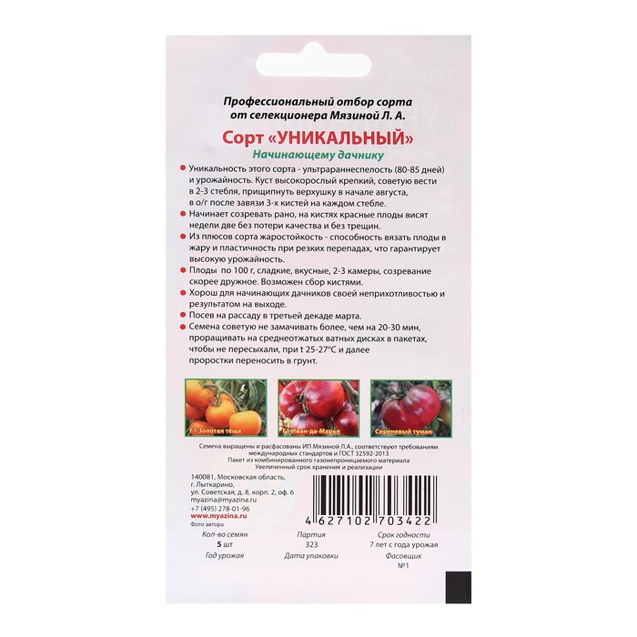 Производитель: Любовь Мязина; Габариты: 15 x 8 x 0,2; Страна: Россия; В боксе: 200 шт; Состав: См. на упаковке; Материалы: см. на упаковке; Фасовка: по 10 шт; Индивидуальная упаковка: Без упаковки; Сертификат: Не подлежит сертификации; Цвет: Красный; Агрономический срок годности, лет: 4; Сроки созревания: Ранний; Особенности выращивания: Открытый грунт; Сорт или гибрид: Сорт; Форма томатов: Круглые Достоинством этого кистевого сорта является ультрараннеспелость (80-85 дней), сохранение всех завязей при перепадах температур, что даёт высокий урожай и относительная устойчивость к заболеваниям. Формировать можно и нужно в 3 стебля в теплице; в открытом грунте и под дугами, удалить два самых нижних пасынка, все остальные пасынки оставить и удалить верхушки после завязывания 2-3 кистей. Плоды 50-60 г до 100 г , красные, сладкие, вкусные, две камеры, созревание скорее дружное. Возможен сбор кистями. Посев на рассаду в третьей декаде марта.
