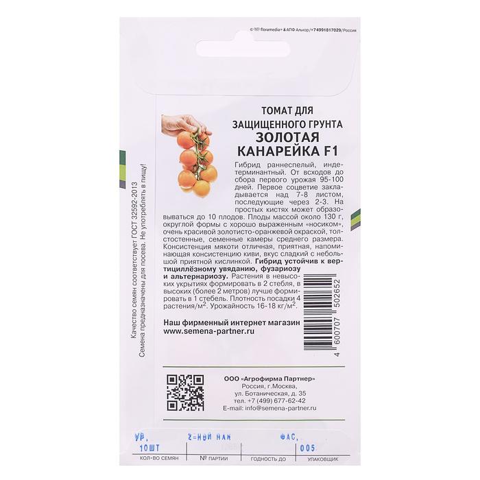 Производитель: Агрофирма Партнер; Габариты: 15 x 8 x 0,1; Страна: Россия; В боксе: 100 шт; Состав: Семена; Материалы: семена; Фасовка: по 10 шт; Индивидуальная упаковка: Без упаковки; Сертификат: Не подлежит сертификации; Цвет: Оранжевый; Агрономический срок годности, лет: 4; Сроки созревания: Ранний; Особенности выращивания: Закрытый грунт (теплицы, укрытия); Сорт или гибрид: Гибрид F1; Форма томатов: Круглые, Черри