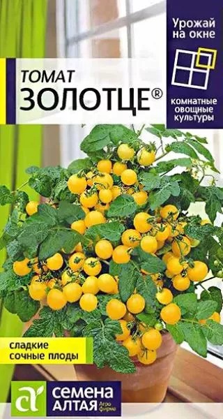 Селекция Агрофирмы «Семена Алтая». Раннеспелый супердетерминантный (высота 25-30 см) сорт для выращивания в открытом грунте, пленочных теплицах, а также в комнатных условиях в качестве горшечной культуры. Куст усыпан плодами золотисто-желтой окраски, массой 25 г. Очень вкусные, сладкие плоды — настоящее лакомство для детей и взрослых. Прекрасно подходят для украшения блюд, великолепны в засолке. При выращивании в комнатных условиях посев возможен в любое время года. Рассаду выращивают в небольших ящиках. Глубина заделки 1 см. Семена высевают на слегка утрамбованный грунт, мульчируют торфом или почвенным слоем 1 см. Оптимальная температура для появления всходов 22-25°С. В фазе 2-3-х настоящих листьев сеянцы пикируют в отдельные горшочки с дренажом, объемом 5-8 л и размещают в теплом, хорошо освещенном месте. Для предотвращения вытягивания растений необходима досветка фитолампами. Уход заключается в редком, но обильном поливе и 2-3-х кратной подкормке комплексными минеральными удобрениями.