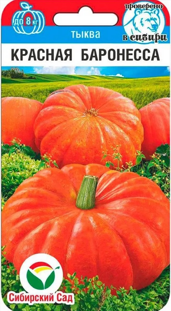 Среднеспелый ( 105-110 дней)сорт с плодами внушительных размеров. Неприхотлив в уходе, отлично хранится после сбора в зимний период. Привлекательные яркие оранжево-красные плоды достигают массы до 8кг, легко режутся, обладают хорошим вкусом и приятным запахом без приторного «тыквенного аромата». Сорт предназначен для выращивания в открытом грунте , рекомендуется для употребления в кулинарии в летний и осенне-зимний период.