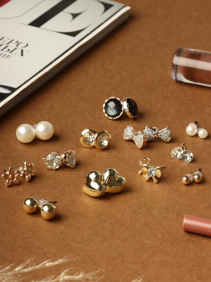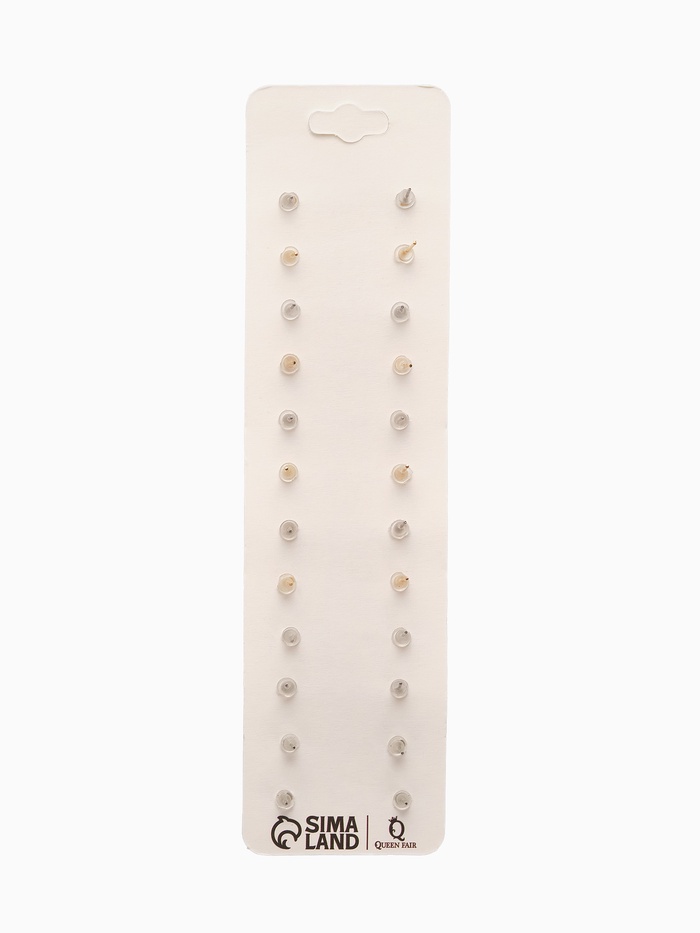 Набор из двенадцати пар стильных серег-гвоздиков в бело-чёрной гамме с золотистым основанием — воплощение утончённости и современной элегантности. Каждый аксессуар длиной 1,2 см аккуратно выполнен из металла с золотым покрытием и украшен вставками из страз, жемчуга и пластика, что придаёт украшениям особое сияние и глубину.
