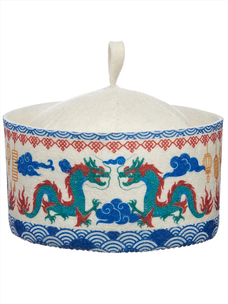 Шапка для бани "Драконы орнамент" нестандартной формы формы сделана из белого фетра премиум-качества и украшена ярким принтом с символом 2024 года.