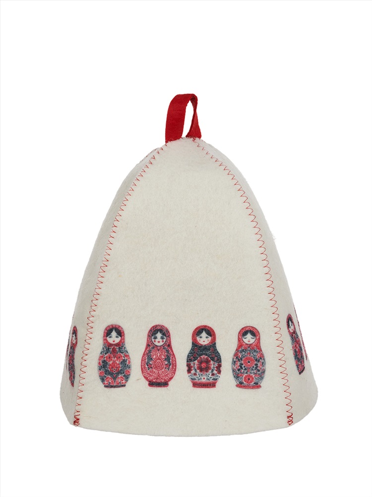 Банная шапка украшена рисунками традиционных русских матрешек, расположенных на клиньях изделия и образующих хоровод. Цветовая палитра включает оттенки красного, серого, черного цветов, подчёркивающих этнический колорит.