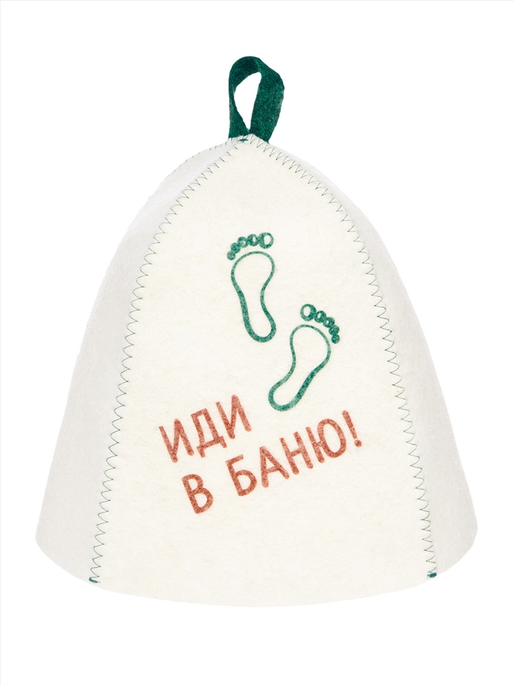 Шапка для бани "Иди в баню" классической формы сделана из белого войлока и украшена ярким принтом.