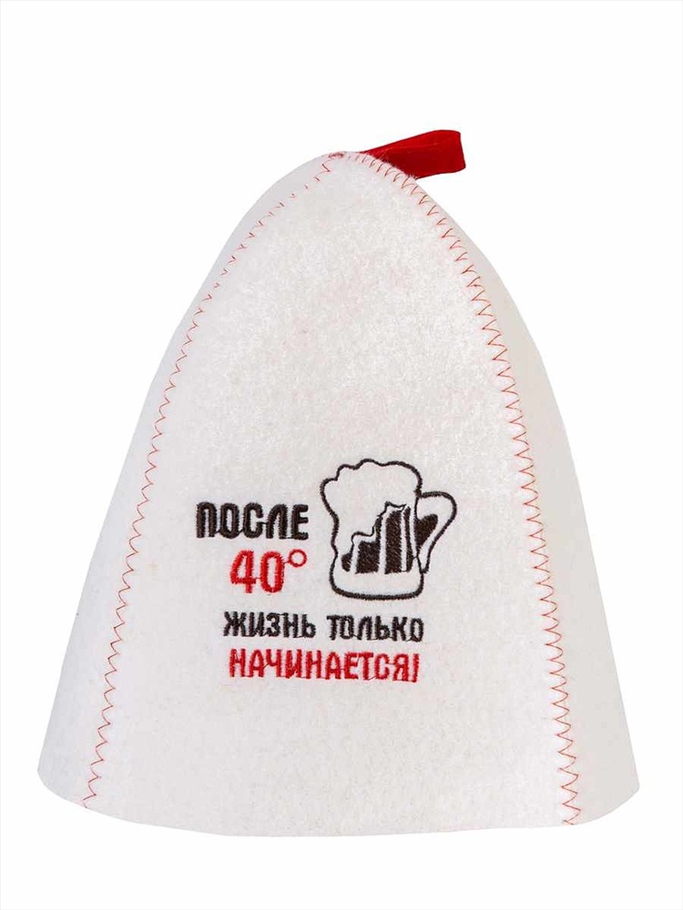 Шапка для бани "После 40..." сделана из белого войлока и украшена оригинальной вышивкой.