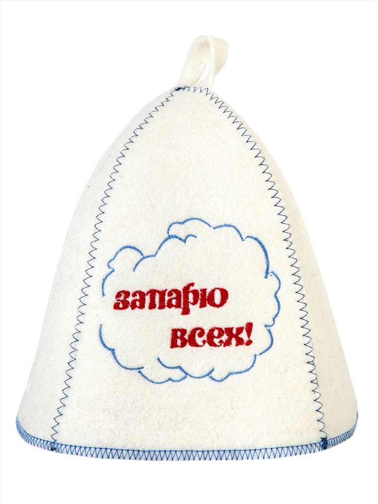3-1./Размер- / изделия, ШхГхВ, ДхШ, Д, Ш, В: 54-60; Полное наименование: Шапка банная с вышивкой "Запарю всех!", войлок белый; Бренд: ГлавБаня; Честный знак: Да; Похожие товары по фильтру: []; Аксессуары по фильтру: []; Количество в упаковке: К.Т.10; Вес коробки: 1.04; Вес: 0.092; Объем: 0.0104 м3