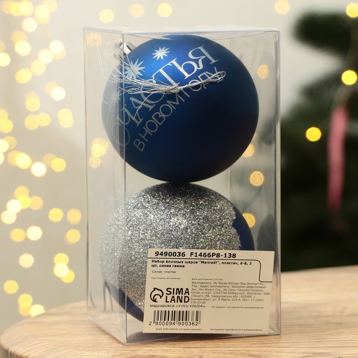 Габариты: 8 x 8 x 16 Страна: Китай В боксе: 90 набор Состав: Пластик Материалы: пластик Фасовка: по 1 набор Индивидуальная упаковка: PVC Габариты товара: 8 см × 8 см × 16 см Сертификат: Не подлежит сертификации Набор: Да Цвет: Синий Высота, см: 16 В наборе, шт.: 2 Диаметр шара, см: 8 Символ года: Нет Материал: Пластик Стиль: Новогоднее барокко Комментарии к товару