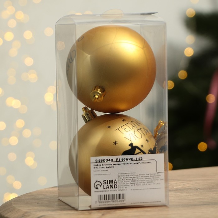 Габариты: 8 x 8 x 16 Страна: Китай В боксе: 90 набор Состав: Пластик Материалы: пластик Фасовка: по 1 набор Индивидуальная упаковка: PVC Габариты товара: 8 см × 8 см × 16 см Сертификат: Не подлежит сертификации Набор: Да Цвет: Золотистый В наборе, шт.: 2 Диаметр шара, см: 8 Символ года: Нет Материал: Пластик Стиль: Новогоднее барокко Шары ёлочные новогодние «Тепла и уюта!», пластик, d=8, 2 шт., золотые Шары изготовлены из пластика, диаметр = 8 см. Набор из таких шаров отлично украсит вашу праздничную ёлочку и будут радовать в новогуднюю ночь. Комментарии к товару