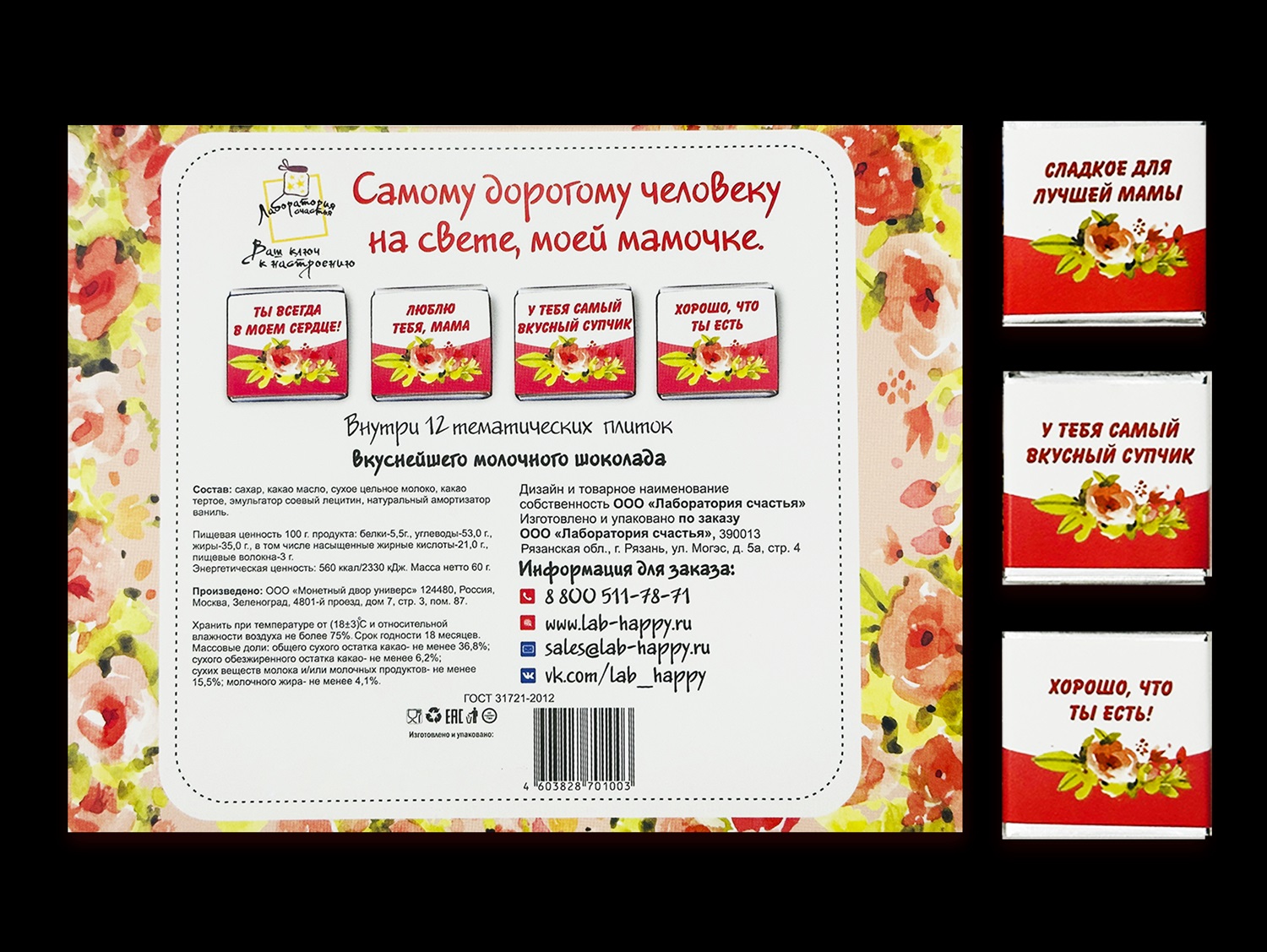 Наполнение: Внутри коробки 12 вкуснейших молочных плиток шоколада по 5гр. размером 31х31мм. Каждая завернута в индивидуальную упаковку под тематику набора. Состав- сахар, какао масло, сухое цельное молоко, какао тертое, эмульгатор соевый лецитин, натуральный ароматизатор ваниль.