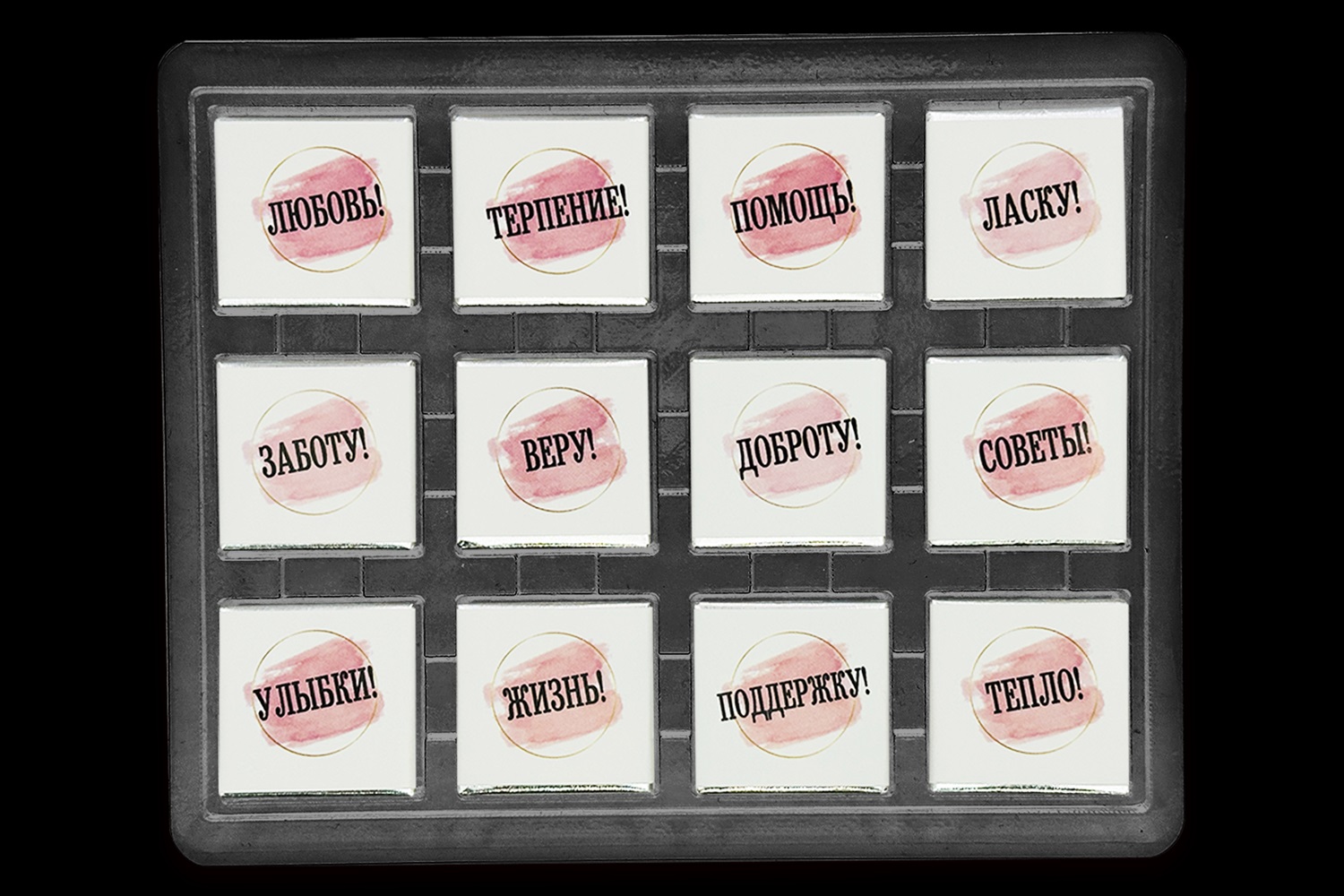 Наполнение: Внутри коробки 12 вкуснейших молочных плиток шоколада по 5гр. размером 31х31мм. Каждая завернута в индивидуальную упаковку под тематику набора. Состав- сахар, какао масло, сухое цельное молоко, какао тертое, эмульгатор соевый лецитин, натуральный ароматизатор ваниль.