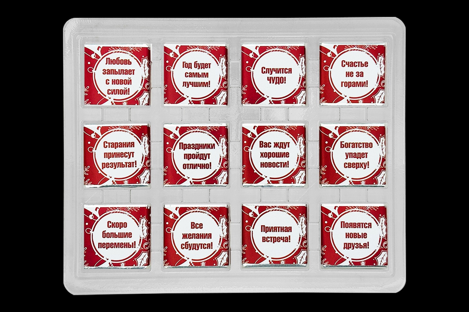 Наполнение: Внутри коробки 12 вкуснейших молочных плиток шоколада по 5гр. размером 31х31мм. Каждая завернута в индивидуальную упаковку под тематику набора. Состав- сахар, какао масло, сухое цельное молоко, какао тертое, эмульгатор соевый лецитин, натуральный ароматизатор ваниль.