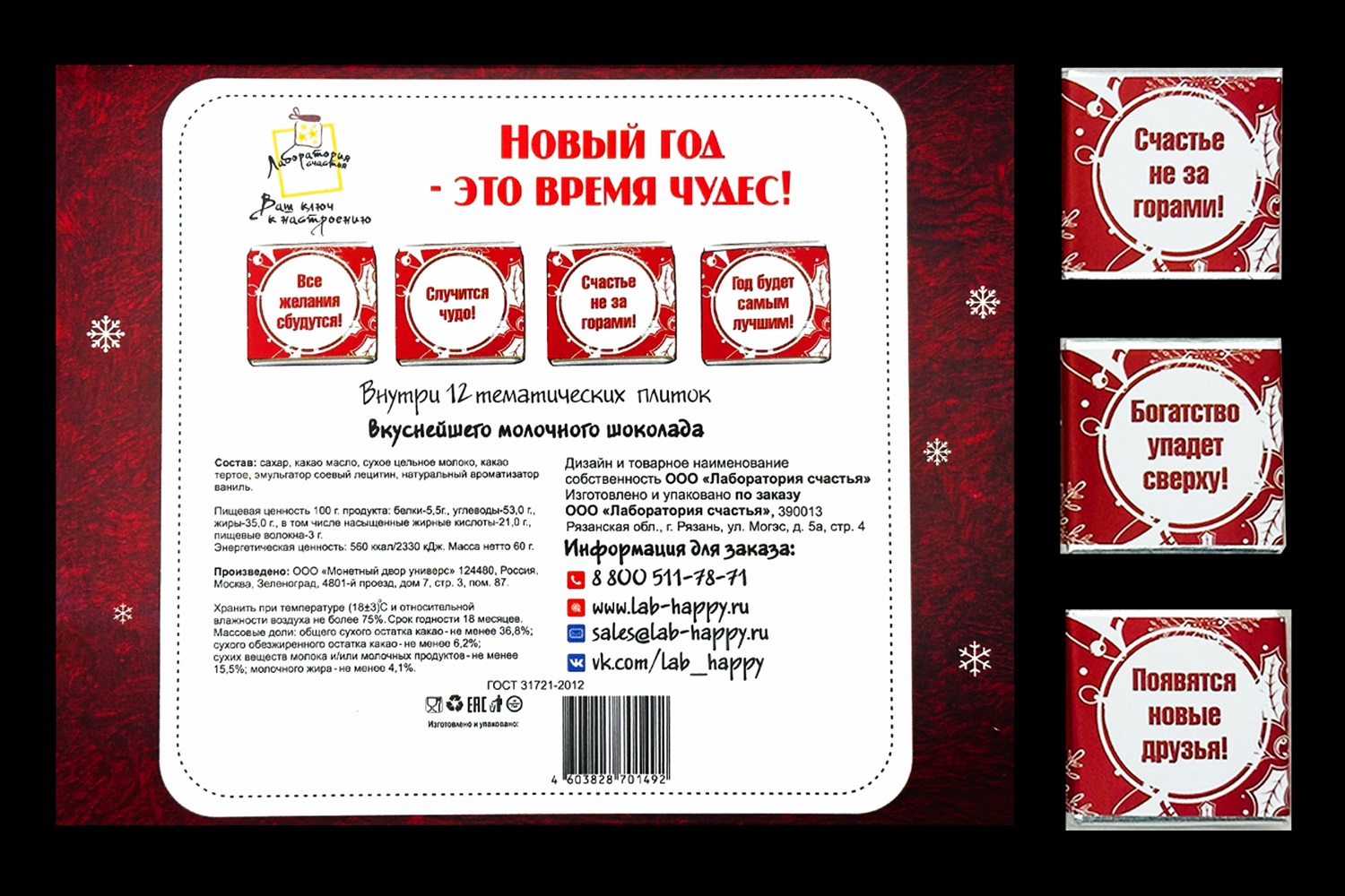 Внутри коробки 12 вкуснейших молочных плиток шоколада по 5гр. размером 31х31мм. Каждая завернута в индивидуальную упаковку под тематику набора. Состав: сахар, какао масло, сухое цельное молоко, какао тертое, эмульгатор соевый лецитин, натуральный ароматизатор ваниль.